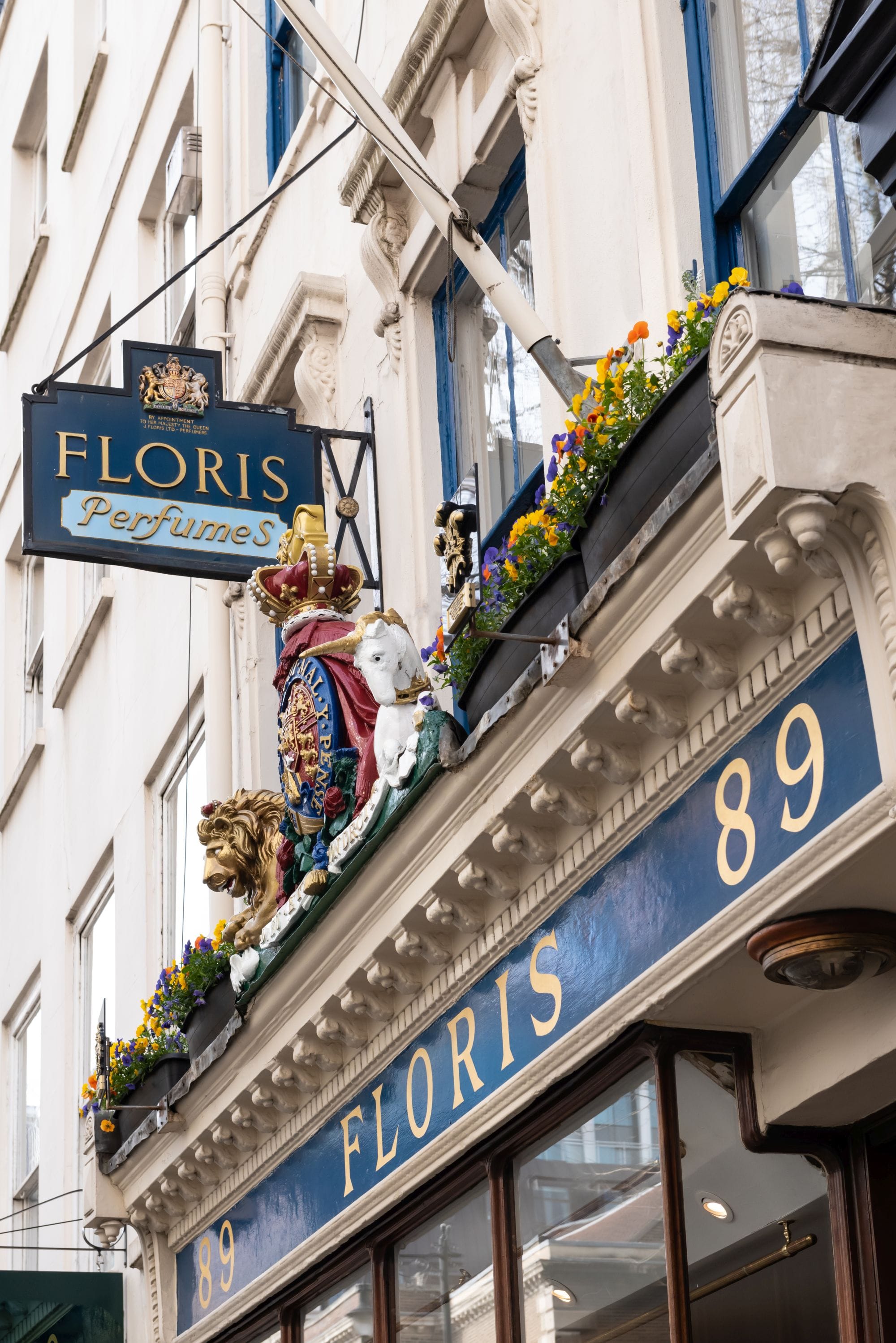 Seit 1730 verkauft Floris hier Parfum und duftende Pflegeprodukte wie Seifen, Shampoos, Hand- und Feuchtigkeitscremes. Das Haus ist über die Jahrhunderte nahezu unverändert geblieben. Direkt nebenan wohnte Isaac Newton, und über der Tür prangt das Wappen, das König George IV. 1820 verlieh. Heute bestätigt König Charles den Royal Warrant als Zeichen für die enge Verbindung des Hauses zum britischen Königshaus.