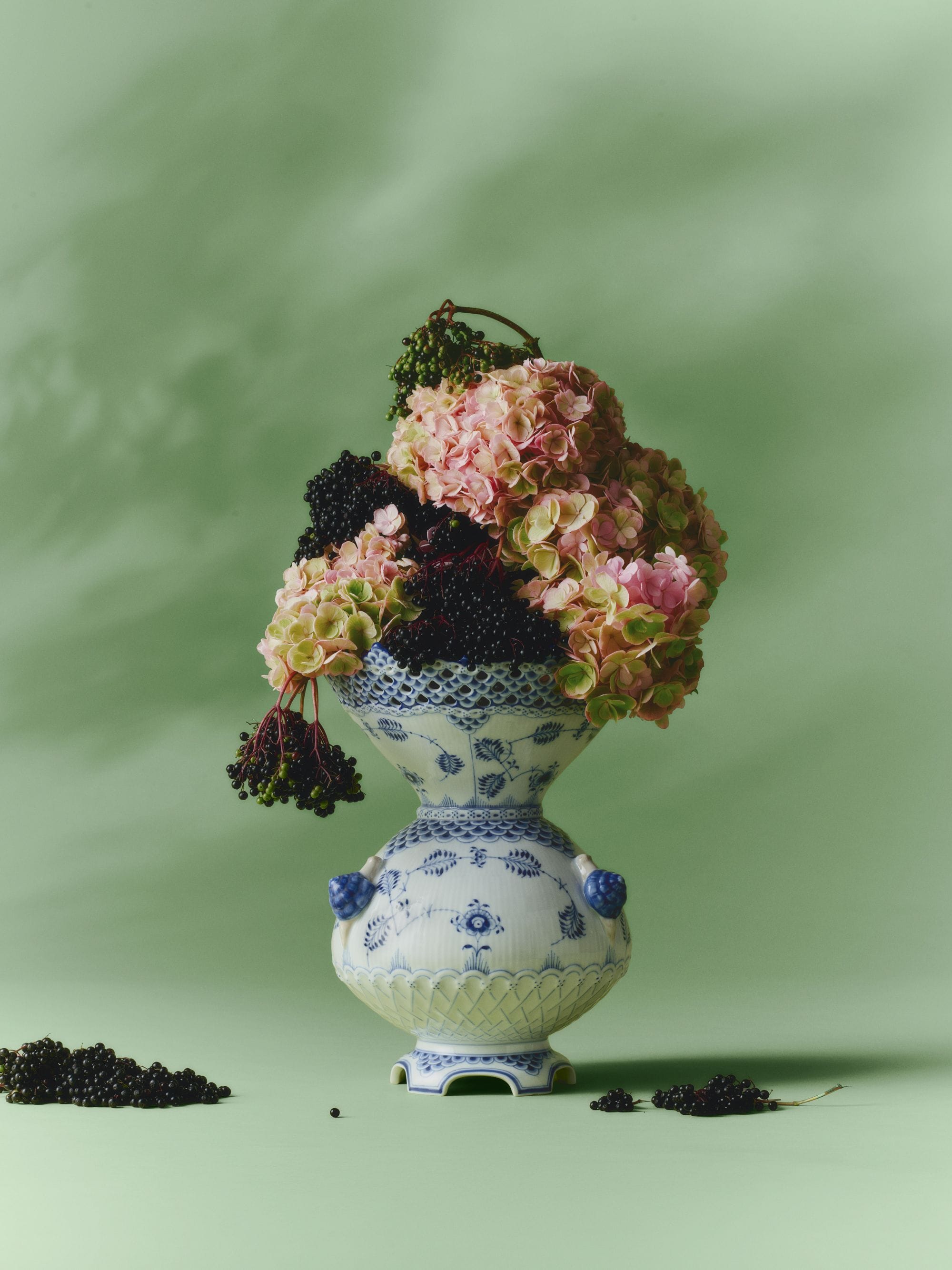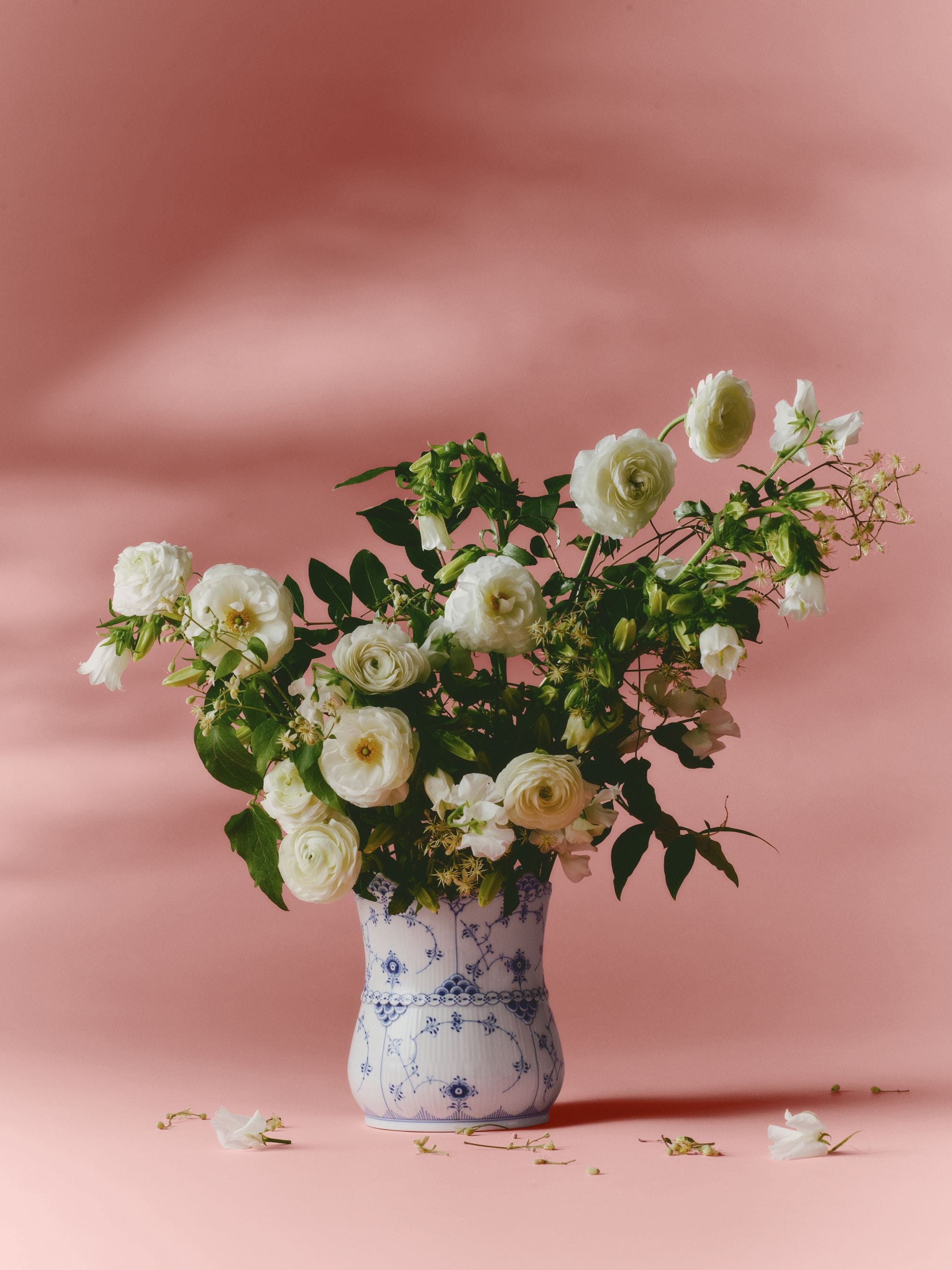 Ein Klassiker aus den Archiven von 1885, neu interpretiert. Balusterförmig, mit filigraner Spitzenbordüre, handbemalt und mit kleinen modellierten Schnecken verziert. Ein Kunstobjekt, das auch ohne Blumen wirkt. Made-to-Order und in Dänemark gefertigt.